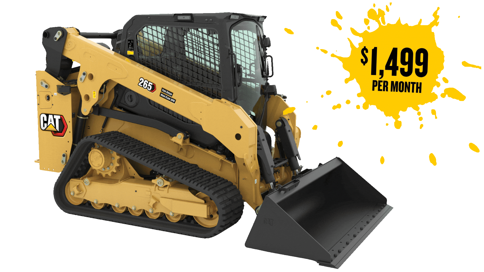 Cat 265 Lease Terms: 36 month agreement for $1,499 per month (plus taxes and fees). Includes a Cat 265 equipped with two speed, Hydraulic Quick Coupler, 80-inch General Purpose Bucket, Performance CVA providing next-day parts and two-day repair, Premier Warranty providing coverage for 36 months or 2,000 hours, and Travel Time and Mileage for Service. Warranty exclusions apply. Customer must take delivery of their machine by April 30, 2026. Lease offer valid April 1, 2026 – April 30, 2026.