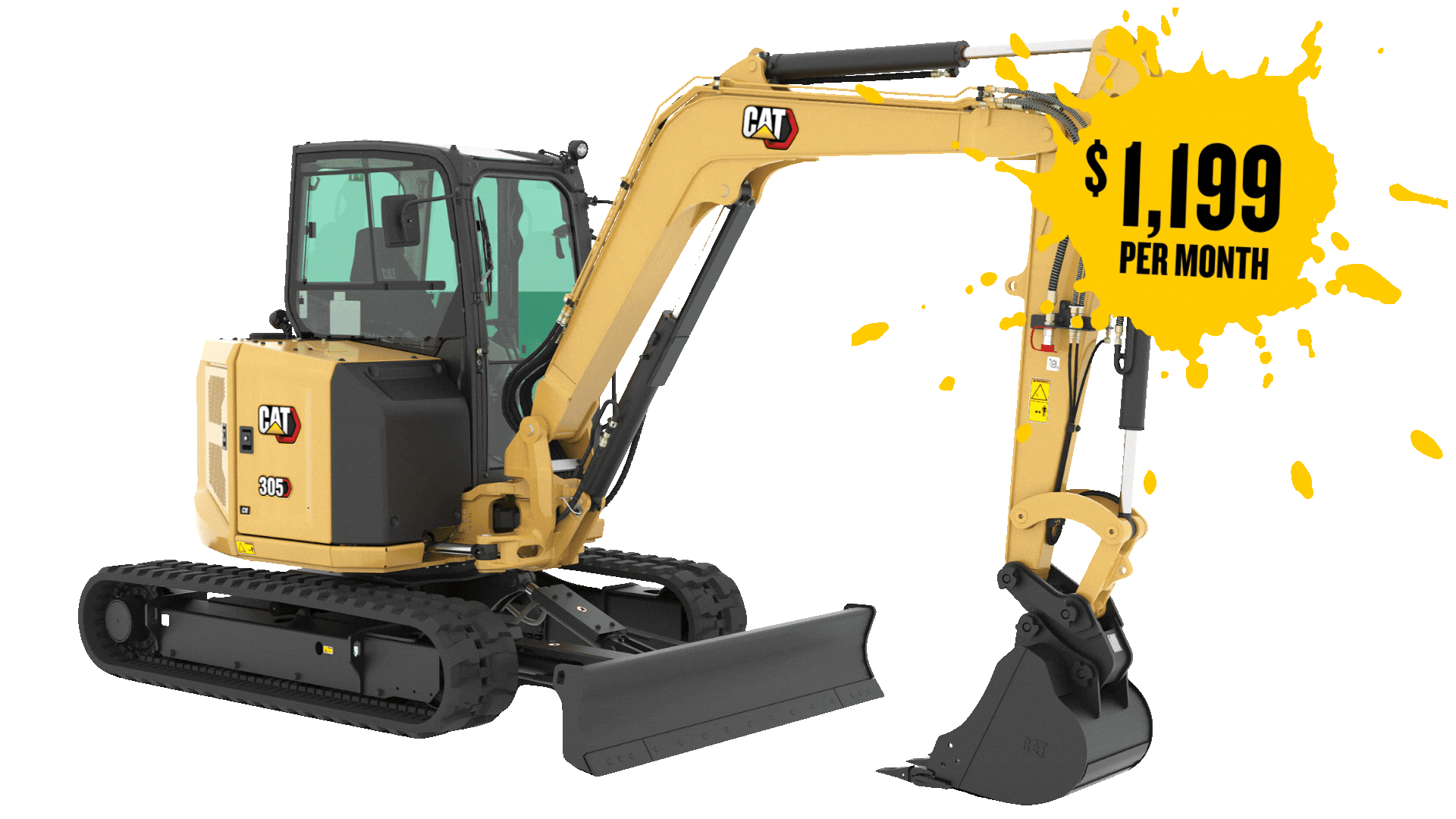Cat 305 CR Lease Terms: 36 month agreement for $1,199 per month (plus taxes and fees). Includes a Cat 305 CR equipped with a Hydraulic Quick Coupler, Hydraulic Thumb, 24 inch Tooth Bucket, Performance CVA providing next-day parts and two-day repair, Premier Warranty providing coverage for 36 months or 2,000 hours, and Travel Time and Mileage for Service. Warranty exclusions apply. Customer must take delivery of their machine by April 30, 2026. Lease offer valid April 1, 2026 – April 30, 2026.