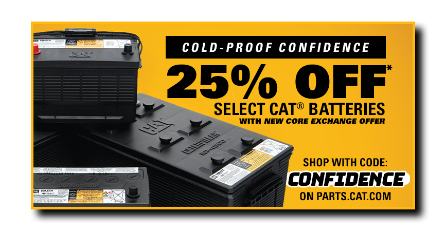 FREEZING TEMPS GOT YOUR MACHINE DOWN? Don’t get stuck in the cold this winter with 25% off select Cat General Duty & Heavy-Duty Batteries. Now is your chance to return your old cores for deep discounts on the batteries known to out-test, out-last and out-perform the competition. See below for offer details.