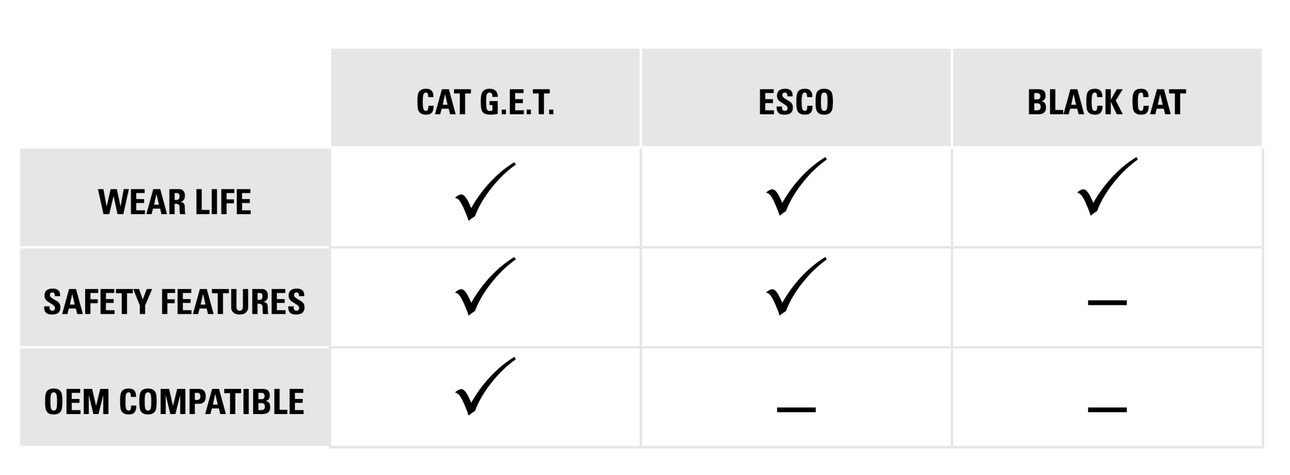 Don’t settle on other aftermarket parts. Cat GET outperforms ESCO and Black Cat in durability and safety.