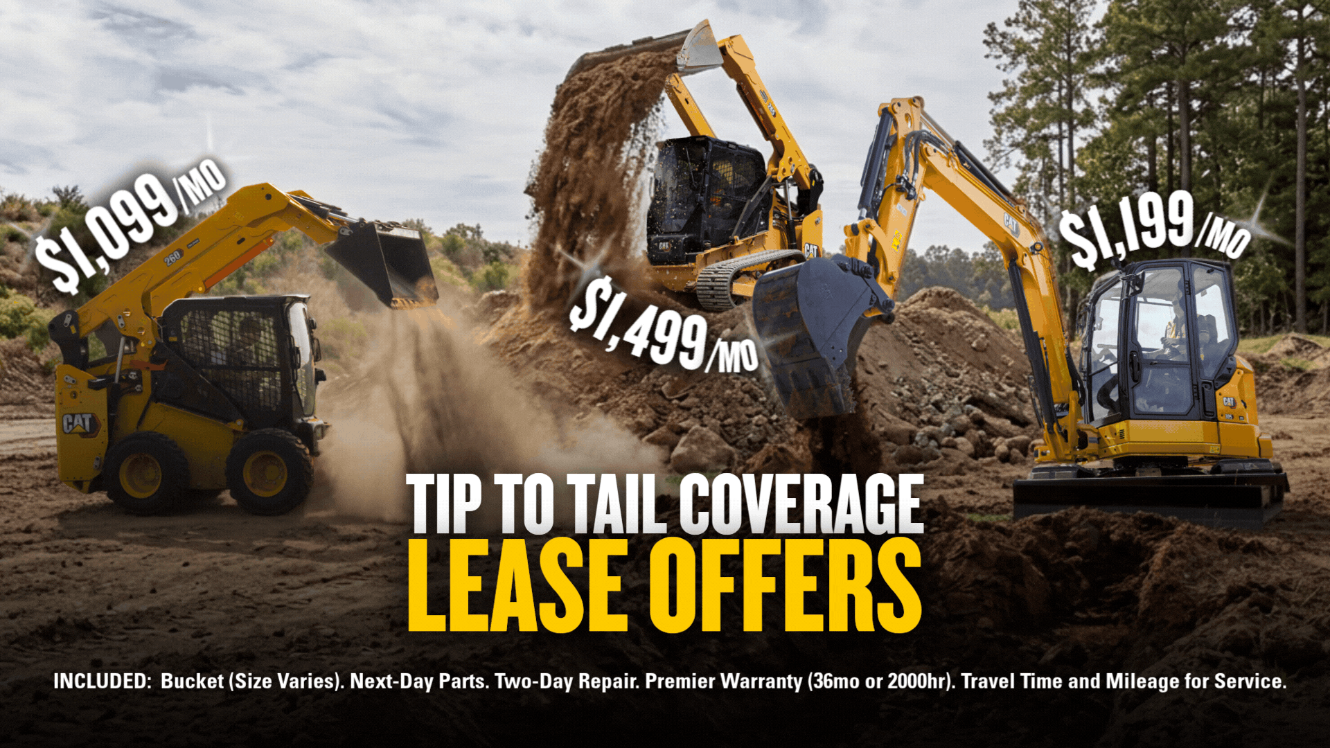 Get unbeatable monthly rates on select Cat Compact Equipment (Skid Steer Loaders: 260, Compact Track Loaders: 255 & 265, and Mini Excavators: 303.5 & 305)! Whether you want the lowest monthly payment or added protection and uptime support, there’s a lease option built for you.