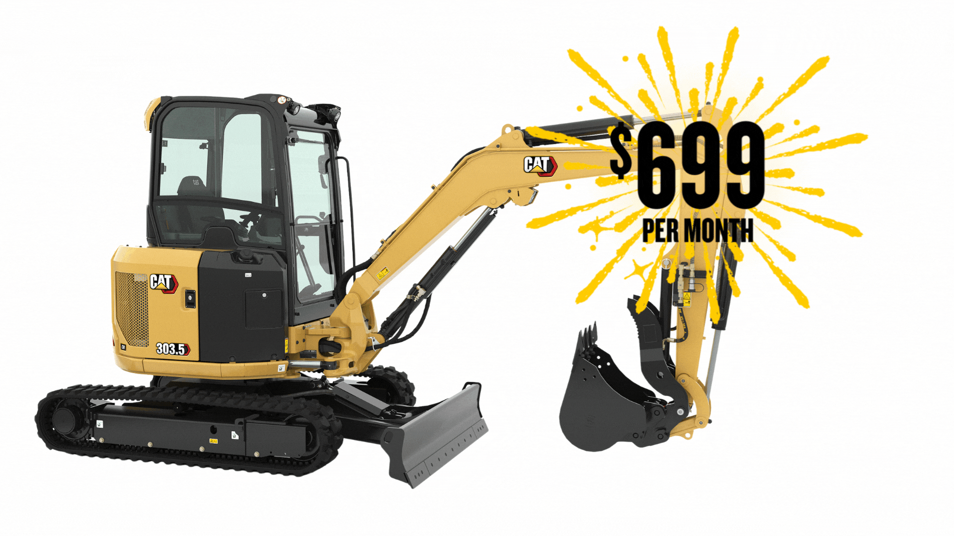 Cat 303.5 DCA3D Lease Terms: 36-month agreement for $699 per month (+ taxes & fees) with a usage limit of 500 hours per year. Includes Cat 303.5 DCA3D equipped with cab, heat/AC, manual coupler, and 24-inch tooth bucket. Customer must take delivery of their machine by February 28, 2026. Lease offer is valid January 8, 2026 – February 28, 2026.