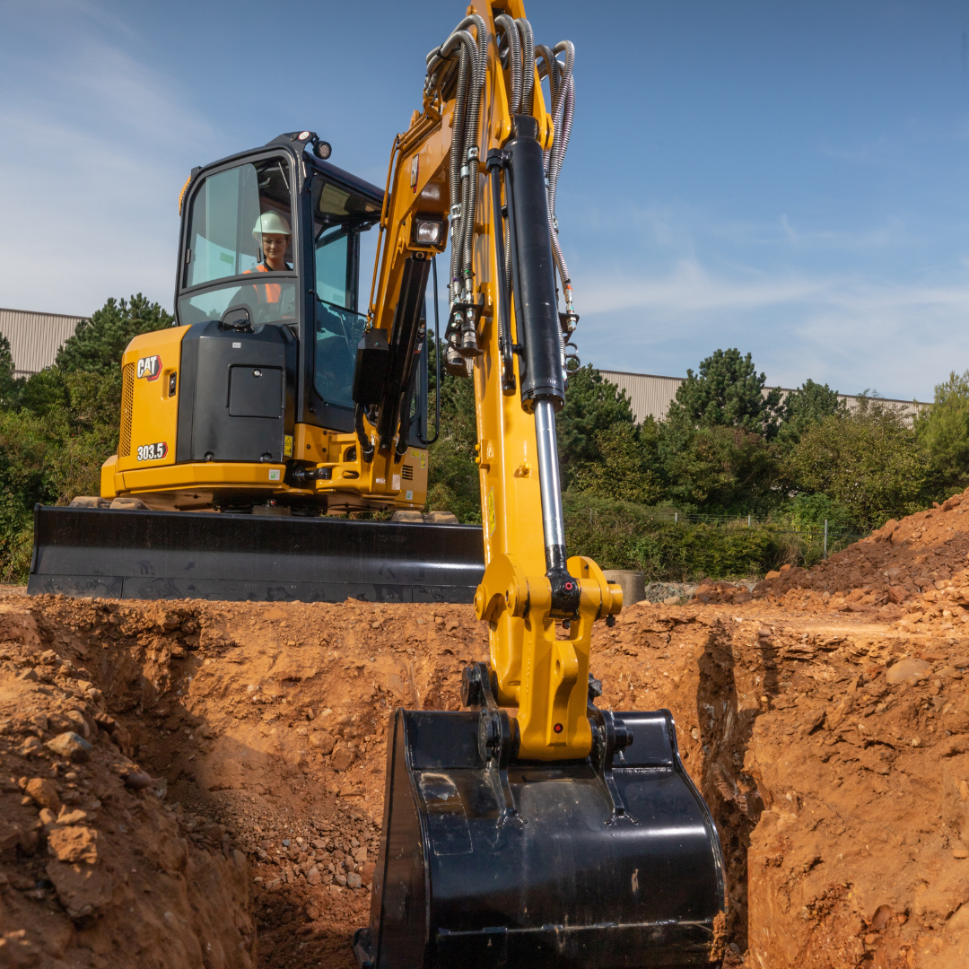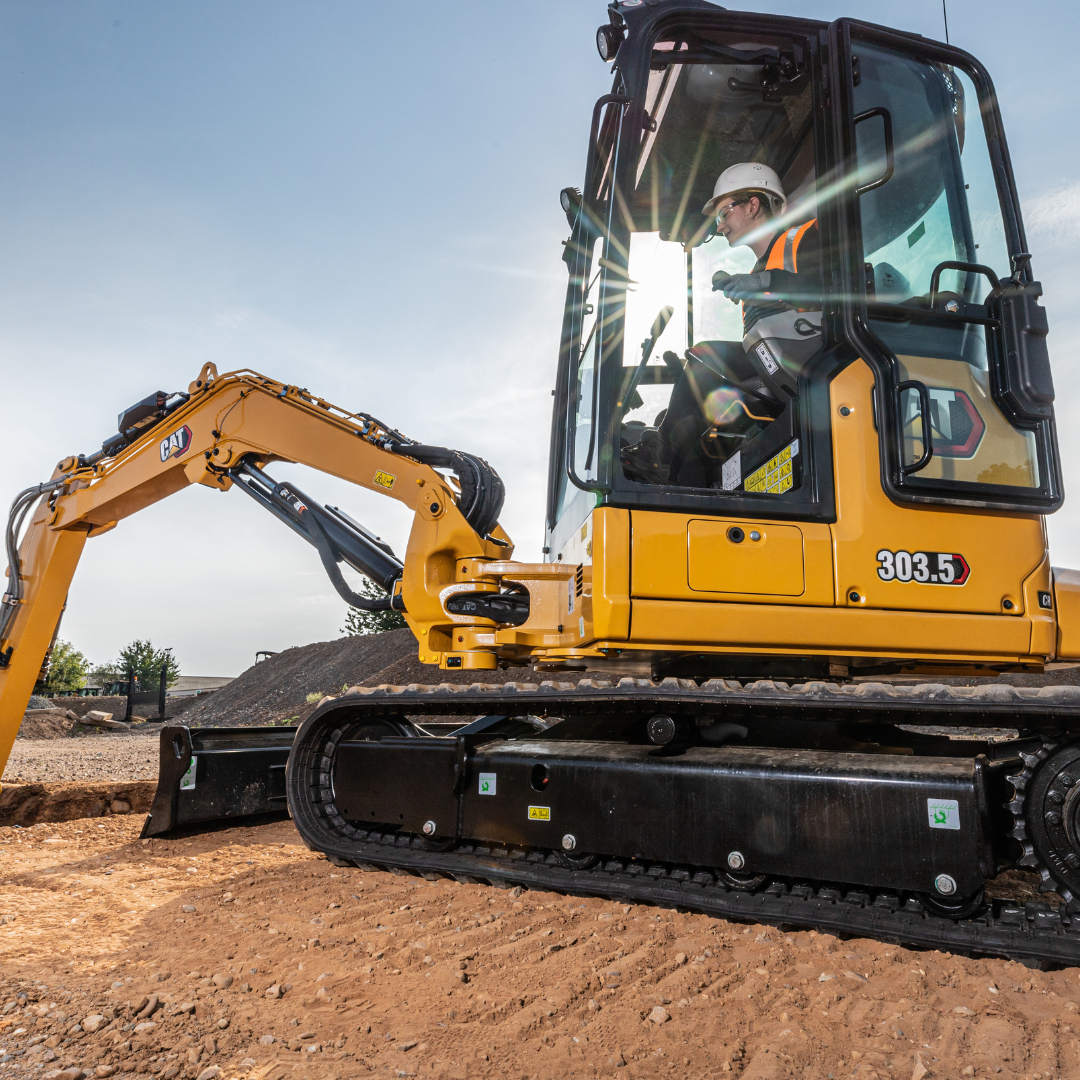 The Cat 303.5 DCA3D Mini Excavator is built for comfort and control, featuring a full cab with heat and A/C, a manual coupler, and a 24-inch tooth bucket for versatile digging power.