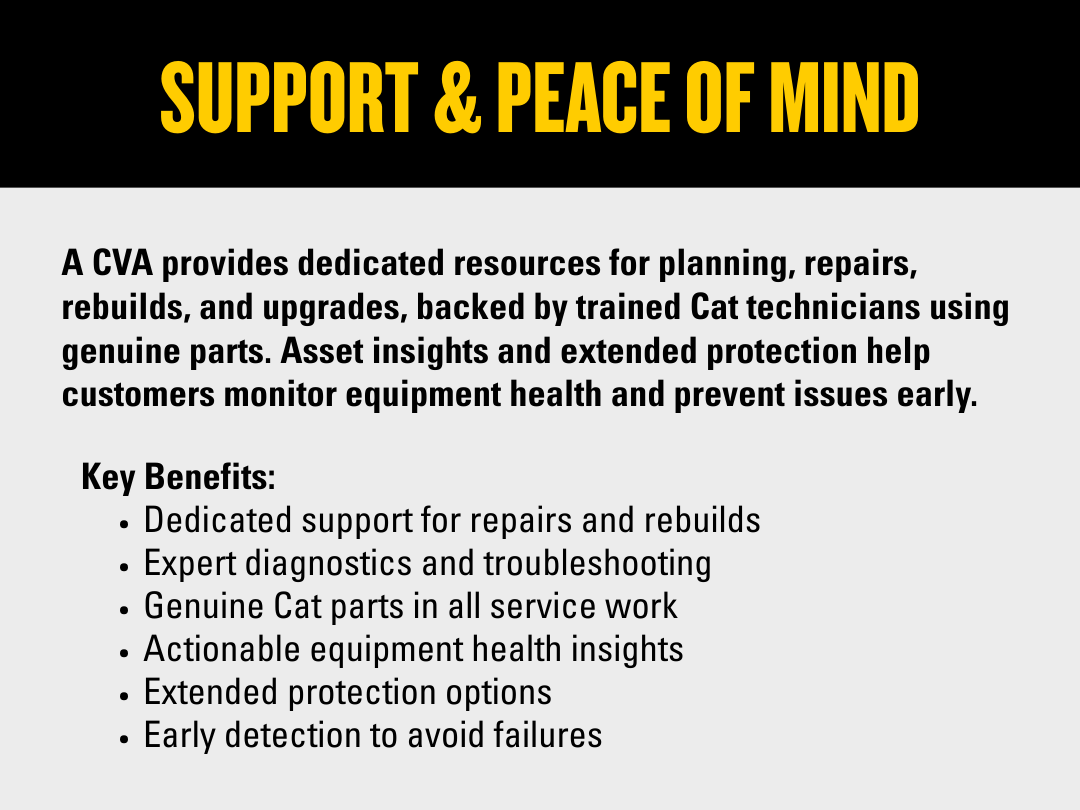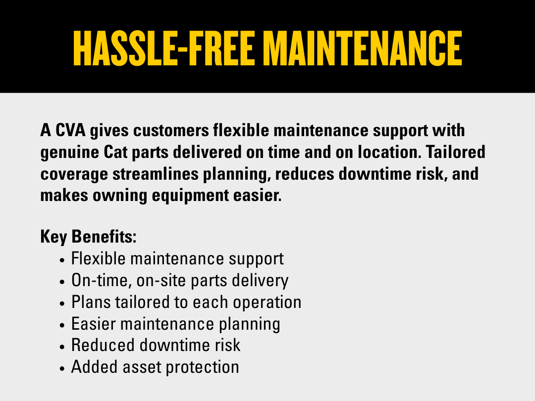 It’s a plan to drive value for your investment and ultimately your business. A Cat® Customer Value Agreement (CVA) helps you get the most out of your assets by keeping them easy to own and ready to run. You get the parts you need when and where you need them, key asset information in the palm of your hand, tools and expertise to manage asset health, and protection plans to reduce risk. And it’s all included in a predictable monthly payment. A path to easy ownership and convenience in day-to-day asset management — that’s a CVA.