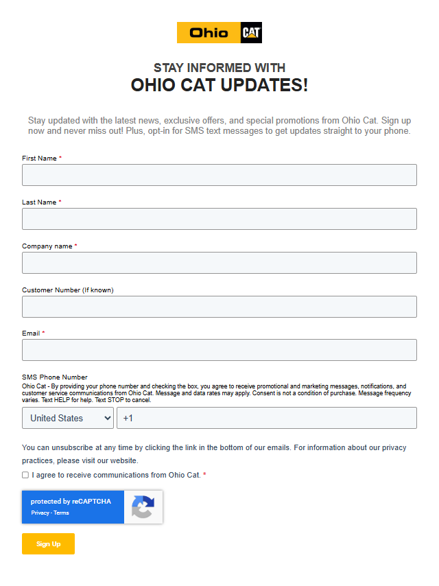 Users who wish to receive order status text notifications must self-enroll using our Parts Delivery Notification Text Sign-Up form, pictured on this page. Users must fill out all required fields and must comply with terms and conditions by checking the box to agree and provide consent to receive communications via SMS/MMS from Ohio Cat. To view the opt-in process, including screenshots and exact language used during enrollment – This page demonstrates user SMS enrollment is optional and separate from any service or giveaway eligibility.